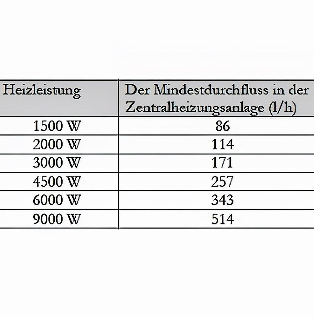 Die Minimaldurchflusswerte – 86 l/h für 1,5 kW, 114 l/h für 2,0 kW, 171 l/h für 3,0 kW, 257 l/h bei 4,5 kW, 343 bei 6,0 kW und 514 bei 9,0 kW – garantieren auch bei variierendem Wärmebedarf eine effiziente Wärmeübertragung und einen reibungslosen Betrieb.