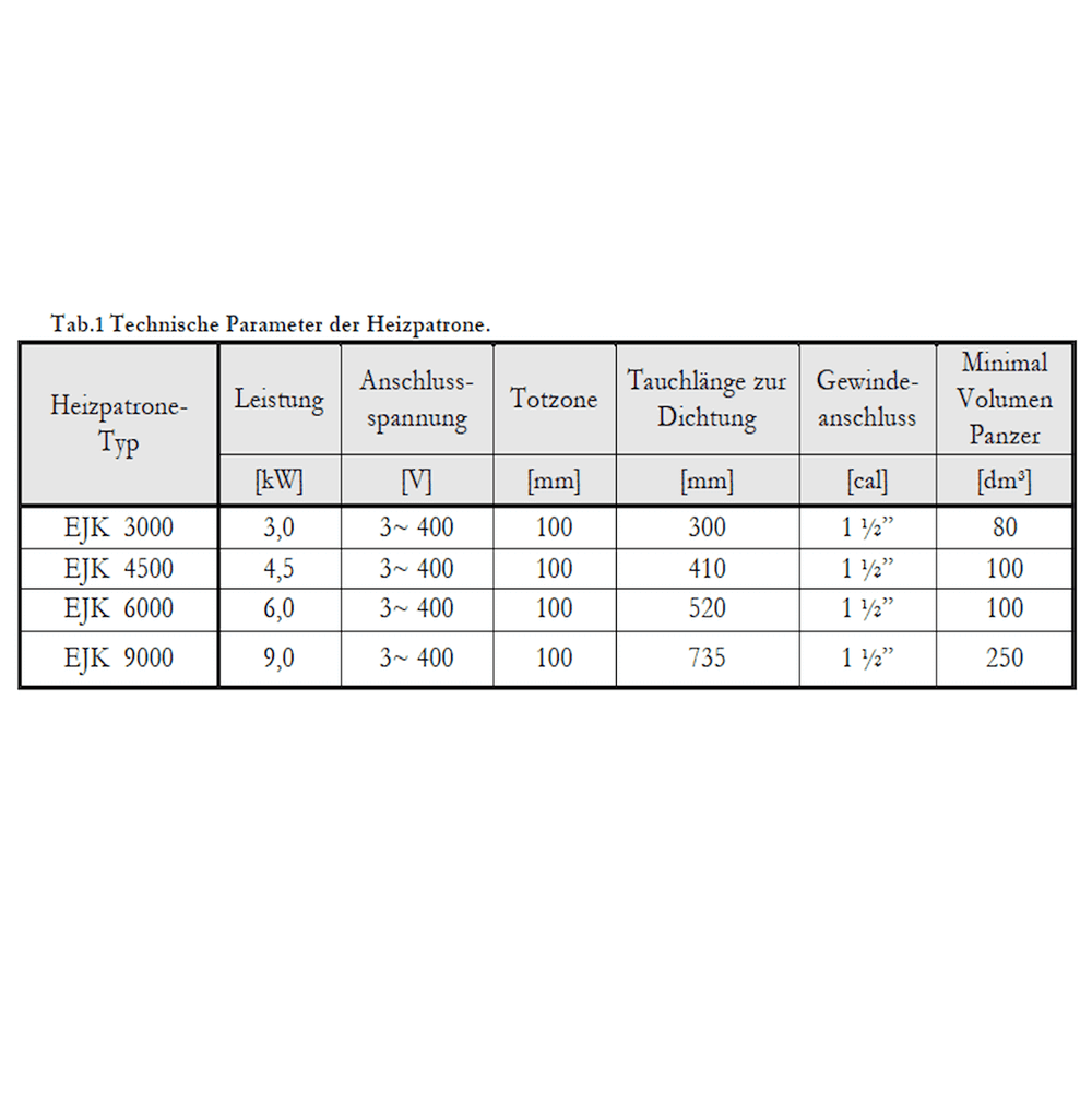 Die Heizpatrone des Komplettpakets ist in unterschiedlichen Leistungsklassen erhältlich, speziell konzipiert für 1,5 kW, 2,0 kW, 3,0 kW bei 230 V sowie 4,5 kW, 6,0 kW und 9,0 kW bei 400 V. Diese Varianten ermöglichen eine optimale Anpassung an den individuellen Energiebedarf des Heizsystems.