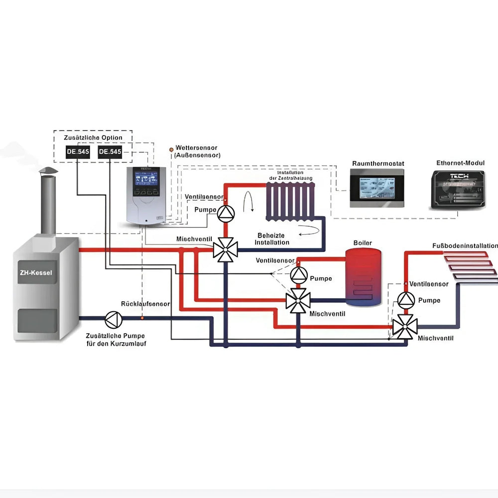 El controlador opera válvulas mezcladoras de tres o cuatro vías, incluyendo la bomba de la válvula y la bomba de agua caliente. Múltiples sensores de temperatura (caldera, válvula, retorno, exterior y agua caliente) permiten una monitorización precisa del sistema. Una pantalla LCD clara y una estructura de menú intuitiva simplifican la operación.