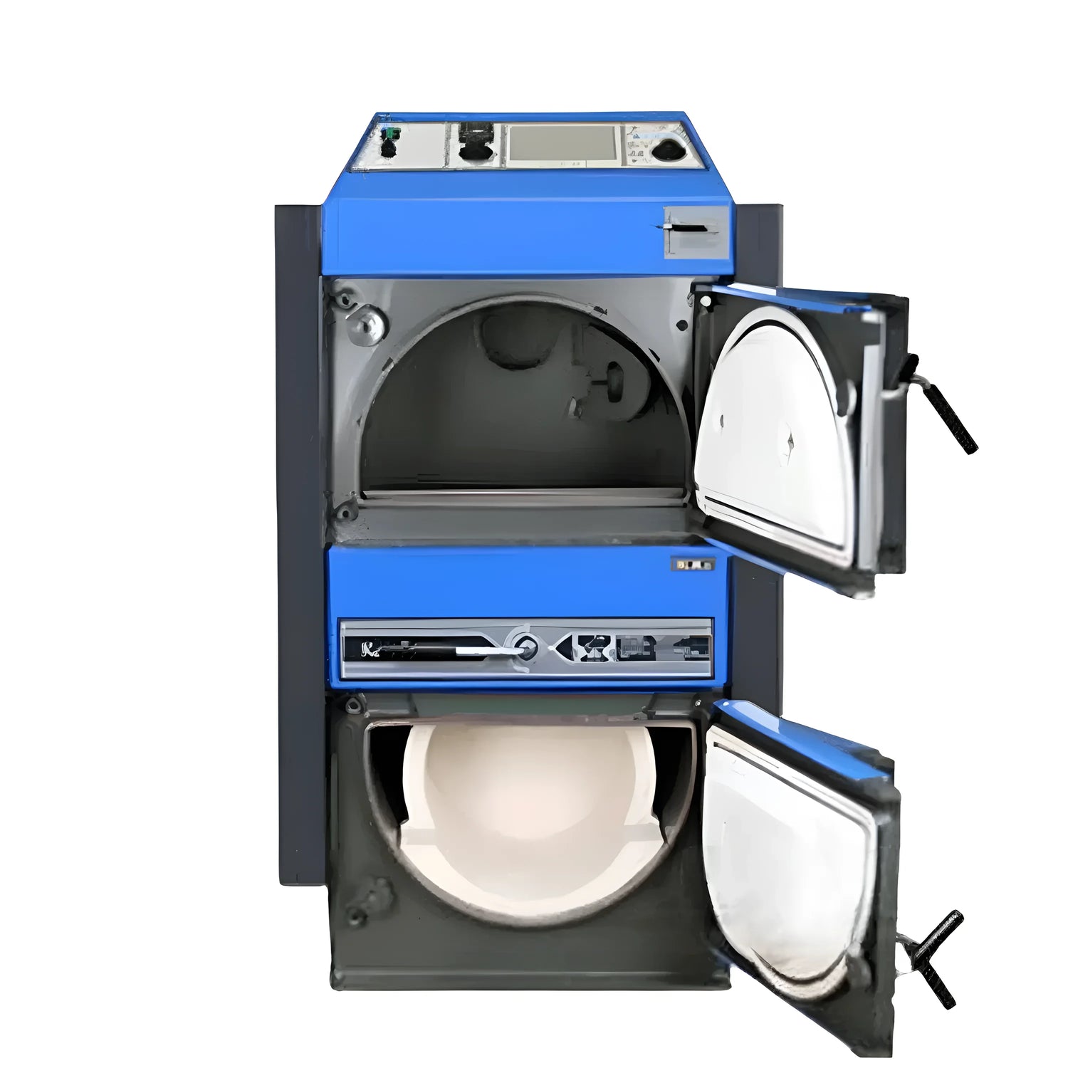 - Caldeira de gaseificação especialmente projetada para vários combustíveis, como briquetes de linhito, carvão duro e toras