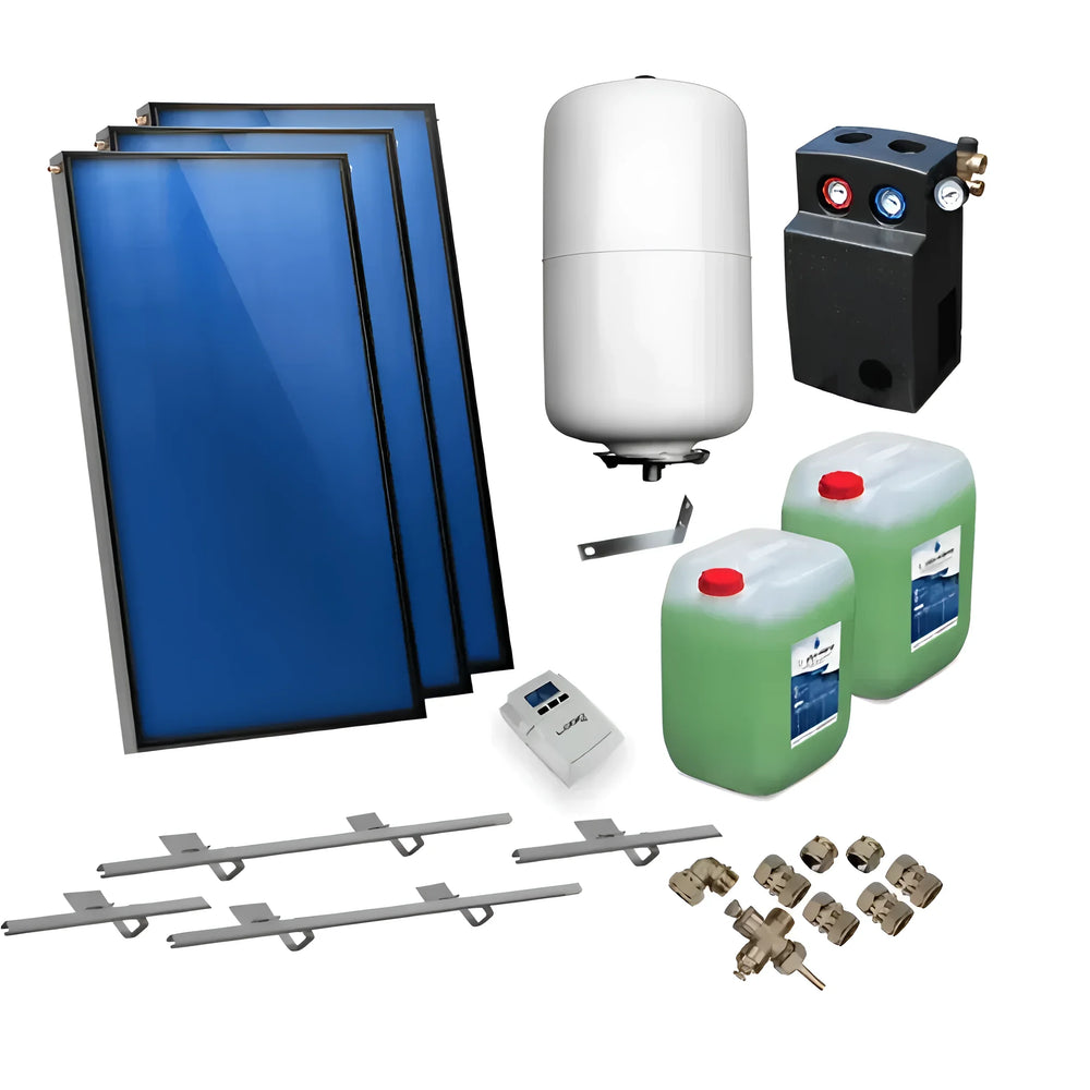 O pacote solar é entregue como um conjunto completo. Além dos três coletores planos AMX 2.38, o escopo de entrega inclui todos os componentes essenciais, como kit de conexão, kit de montagem, tanque de expansão solar, bem como a moderna estação solar e o sistema de controle solar. Instruções detalhadas auxiliam os instaladores na instalação rápida e tranquila.