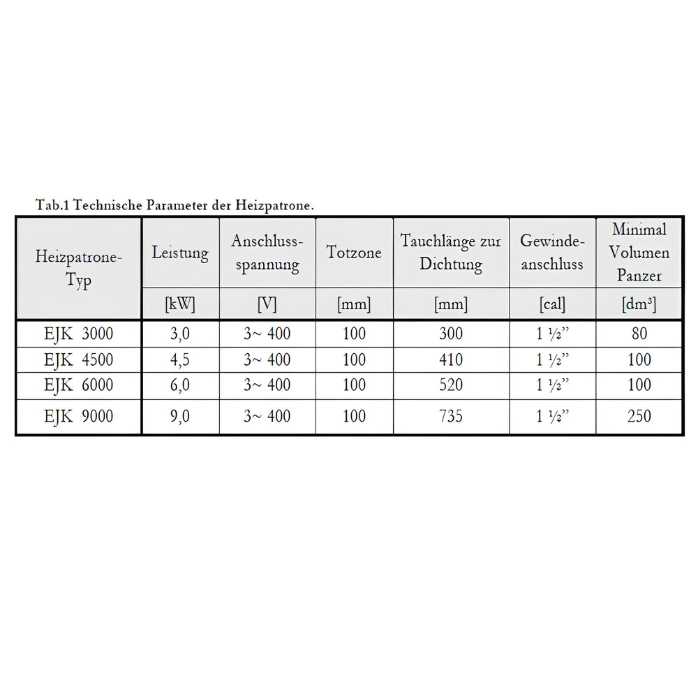 Grelni vložek celotnega paketa je na voljo v različnih razredih moči, posebej zasnovanih za 1,5 kW, 2,0 kW, 3,0 kW pri 230 V in 4,5 kW, 6,0 kW in 9,0 kW pri 400 V. Te različice omogočajo optimalno prilagoditev individualnim energetskim potrebam ogrevalnega sistema.